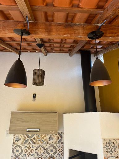 Churrasqueira com balcão e iluminação decorativa