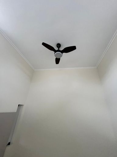 Sala de estar com painel de TV, ventilador de teto e pé direito duplo